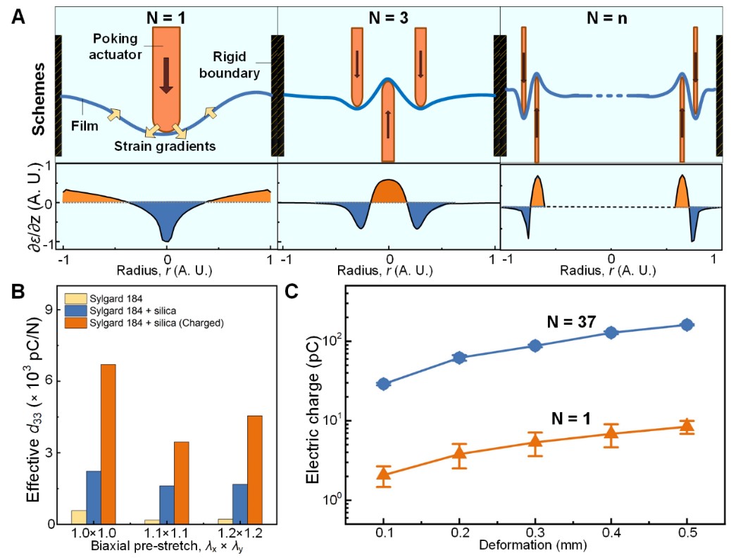 徐明龙教授团队以其在挠曲电效应及其调控方法的研究积累为基础,设计了“三级跳”式的巨大类压电效应实施方案:即采用具有巨大弹性变形范围的介电弹性体非压电材料,首先对其进行宏观尺度的双轴预拉伸,以改变材料微观尺度的等效电荷中心非对称性、并通过调控交联密度进一步提升挠曲电系数水平;再植入纳米驻极体颗粒并利用其与交联网络尺寸匹配的手段预设局部的微观应变梯度;最后将净电荷“注入”驻极体颗粒并巧妙地利用交联网络进行颗粒的物理约束和锁止,进一步改变微观结构中正、负电荷中心位置,增强了力电耦合效率。力学设计方面,团队利用“戳”的手段在宏观尺度上构造了巨大的局部应变梯度,实现了巨大的挠曲电效应。图1为利用非压电材料的挠曲电原理调控巨大类压电效应的基本原理。图2为 “三级跳”式方法对材料挠曲电效应的提升效果。图3为巨大应变梯度的力学设计思路及类压电系数提升过程。