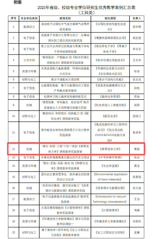 近日,我校2025年研究生教学评优结果揭晓,我院菅振老师凭借《高等流体力学》课程建设的突出成果,斩获校级双项荣誉。其教学案例《"理论-科研-工程"三位一体的〈高等流体力学〉课程教学实践探索》获评"2025年校级专业学位研究生优秀教学案例",同时该课程成功入选"研究生校级课程思政示范课程",彰显了我院在研究生教育教学改革中的创新成效。