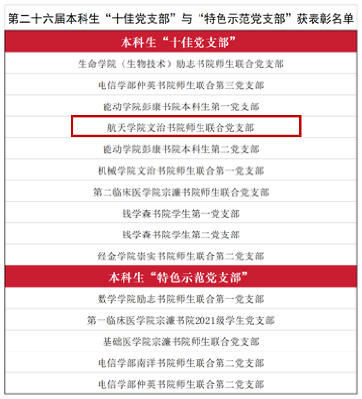 第二十六届本科生“十佳党支部”评选结果揭晓,航天学院文治书院师生联合党支部凭借扎实的支部建设、过硬的工作成效和突出的先锋作用,获评校“十佳党支部”。这是该支部自2023年、2024年连续两年获校“十佳党支部”后,再获此殊荣,充分展现了支部强大的凝聚力、战斗力和新时代学生党员的青春风采。